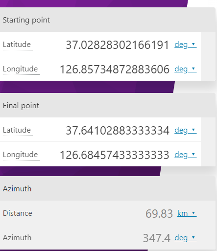 import math import numpy Angle = Azimuth( 37.02828302166191 , 126.85734872883606 , 37.64102883333334 , 126.68457433333333 ) Angle = Azimuth( lat1 , lng1 , lat2 , lng2 )4. 결과