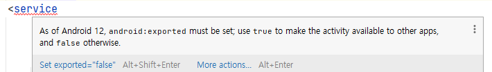<service android:name="com.example..........." android:exported="false"> <intent-filter> <action android:name="com.example........" /> </intent-filter> </service>위 처럼 android:exported를 정의해주면 됩니다.