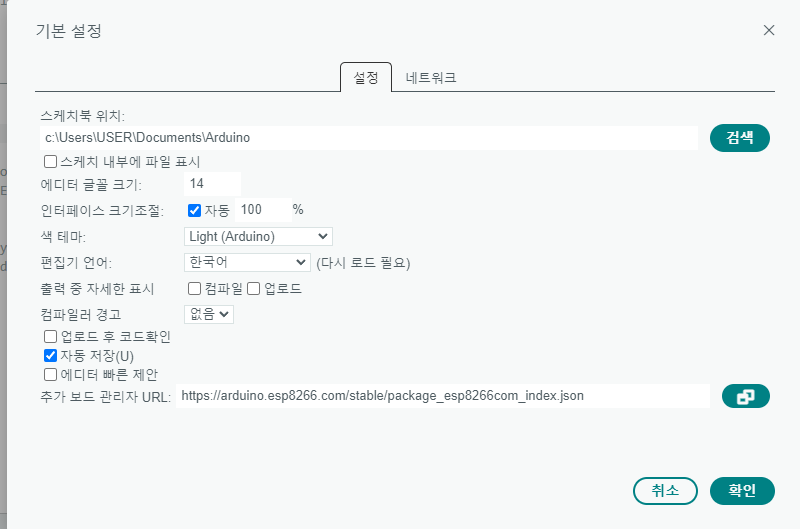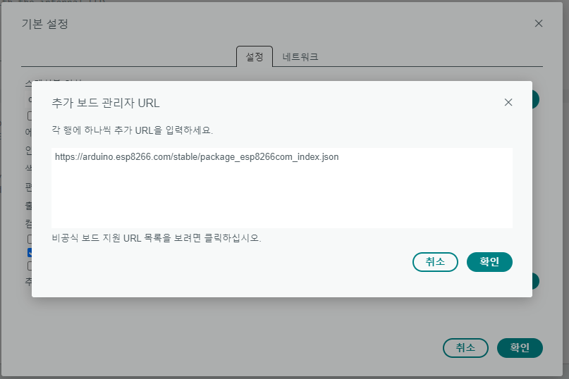 파일 > 기본설정 > 추가보드 관리자URL 에 esp8266를 추가해준다.