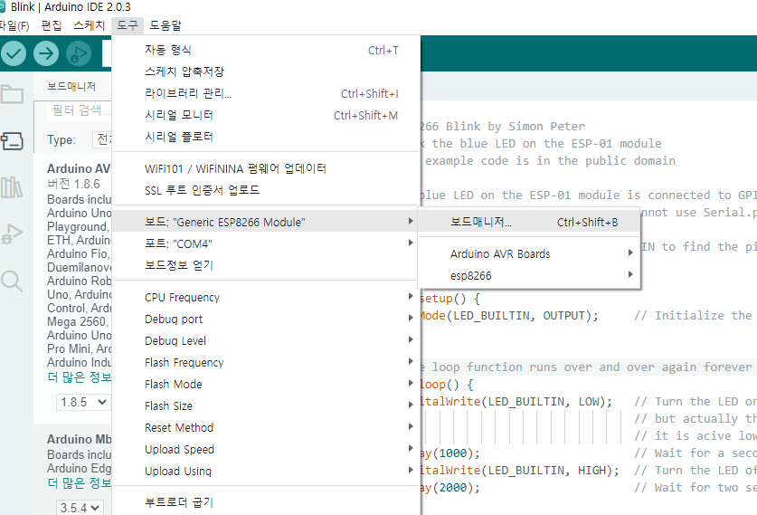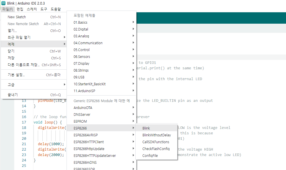 파일 > 예제 > ESP8266 > Blink 클릭 하면 샘플 프로젝트가 열린다.