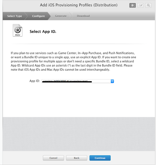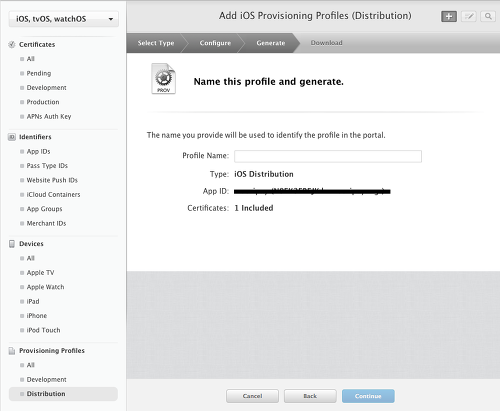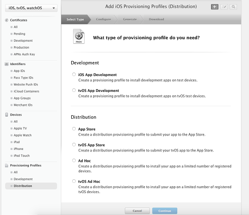 Provisioning Profiles-> All -> Click -> + 버튼 클릭