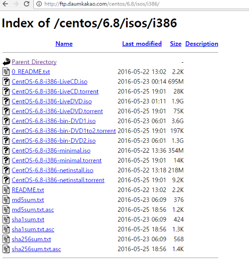 centos/ -> 다운받고자 하는 버전 클릭 (저는 6.8 설치) -> isos/ -> 32/64 비트수중 원하는것 선택 -- > 이미지처럼 보이는곳으로 왓으면 여기서 가장 용량이 큰것 선택하여 다운로드